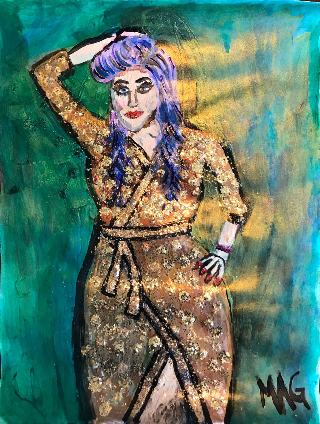 I didn’t reference a specific photo when I started to paint. I began with the idea in my head and I looked at a few photos online for inspiration. As I worked on the shape and positioning of the body, I consulted my image in the mirror. For example: how does the arm in a certain position show the hand in relation to the hips? How does the arm angle when holding the hair up? I had a lot of fun with the glitter and colors of the background and the girl’s hair.